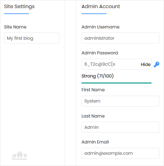• Admin Username: Your new Dotclear username (for security reasons, do not use the administrator or the admin username).