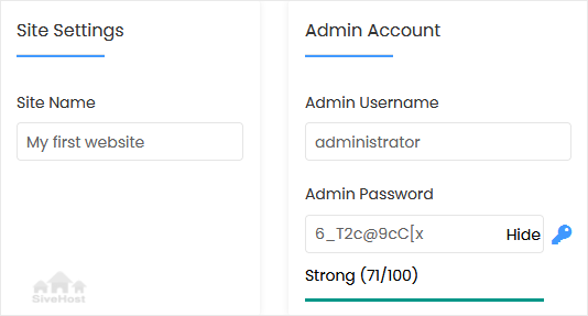 • Admin Username: Your new HTMLy username (for security reasons, do not use the administrator or the admin username).